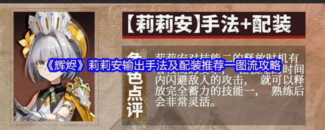 在辉烬游戏里莉莉安不仅拥有丰富的战斗技能,还具有出色的防御与闪避能力,能够在战斗中灵活应对各种情况,好的配装才能拥有高的战力,下面是小编给大家带来的《辉烬》莉莉安输出手法及配装推荐一图流攻略,感兴趣的小伙伴们一起来看看吧。 赤痕输出手