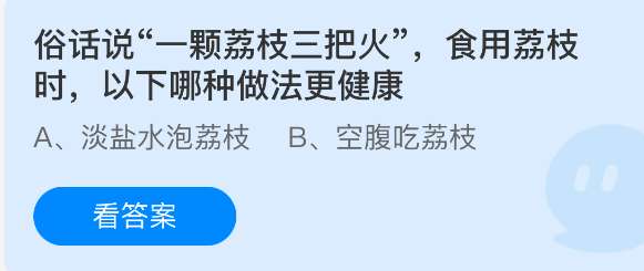 俗话说“一颗荔枝三把火”,食用荔枝时,以下哪种做法更健康?这是支付宝蚂蚁庄园小鸡答题8月2日题目,支付宝小鸡答题是大家非常喜欢的活动,大家获取饲料就可以喂养小鸡领取更多的蛋去帮助更多的人了!今日正确答案是【淡盐水泡荔枝】,食用荔枝时,用淡