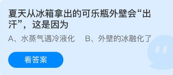 夏天从冰箱拿出的可乐瓶外壁会“出汗”,这是因为?这是支付宝蚂蚁庄园小鸡答题8月2日题目,支付宝小鸡答题是大家非常喜欢的活动,大家获取饲料就可以喂养小鸡领取更多的蛋去帮助更多的人了!今日正确答案是【水蒸气遇冷液化】,夏天从冰箱里取出的饮料温度