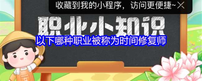 以下哪种职业被称为“时间修复师”?这是支付宝蚂蚁新村2025年7月18日题目,每天在蚂蚁新村答题,可以提高木兰币的产速,帮助小镇建设。点击正确答案,会获得“产速+3/时”更多的奖励。今天正确答案是【古钟表修复师】。钟表是时间见证者,因此