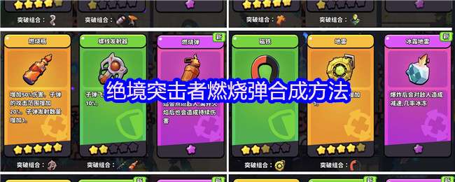在绝境突击者游戏中燃烧弹需要合成获得!5星燃烧瓶与1星螺线发射器组合可以突破进阶变为燃烧弹。燃烧弹技能:改变颜色扩大面积火焰会点燃敌人离开火焰后也会造成持续伤害。 >>>《绝境突击者》超武合成图鉴 绝境突击者