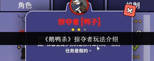鹅鸭杀掠夺者怎么玩?鹅鸭杀出的掠夺者近期可谓有着极高的话题度,毕竟它虽然属于坏人阵营,但自身并没有能连续开出多刀的能力,且要想让自己的技能产生效果还得先去满足前置的条件,让许多人根本不了解鹅鸭杀掠夺者有什么用?其实,掠夺者是一个很有趣的角色