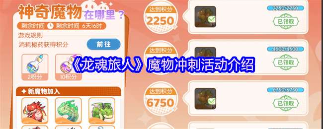 魔物图鉴的推出正好卡在战力排行结算这天,又是添了把火。下面是小编给大家带来的《龙魂旅人》魔物冲刺活动介绍,感兴趣的小伙伴们一起来看看吧。 《龙魂旅人》魔物冲刺活动介绍 魔物图鉴 平民玩家每天买1次紫药水(1200钻),中