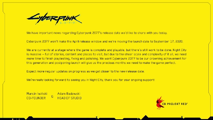 原定于今年4月正式发售的《赛博朋克2077》跳票了。据CDPR在最新官方公告,延期发售是为了要将这款游戏变得更加完美。