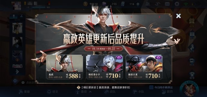 备受期待的RMB英雄嬴政重做后归来!据王者荣耀游戏内公告,嬴政英雄更新后品质提升,将于1月16日更新后上线。
