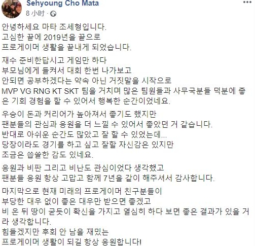 《英雄联盟》Mata昨夜在社交媒体宣布退役,随着今年paWn、Imp以及Mata宣布退役,至此SSW夺冠五人全部退役
