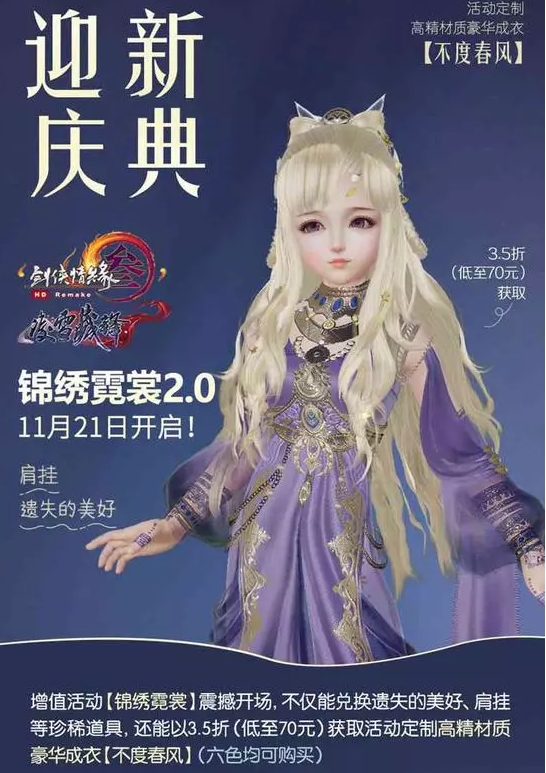 剑网3为了迎接“凌雪藏锋”资料片的到来,“迎新庆典”活动——“锦绣霓裳2.0”也将于今日率先开启!并将为侠士带来精美的折扣外观“锦绣霓裳·不度春风”,