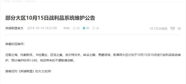 英雄联盟在10月15日这天,一些大区即将进行系统的更新维护,其中战利品系统无法使用,很多玩家还不明白是怎么回事,下面就来为大家分享一下具体的情况。亲爱的召唤师:征服之海,均衡教派,卡拉曼达,巨龙之巢,皮尔特沃夫,峡谷之巅,男爵领域,教育网大