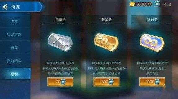 战歌竞技场中商城中购买哪些东西是比较划算的呢?什么东西是比较推荐玩家购买的呢?下面就跟随小编一起来了解一下吧! 战歌竞技场商城购买攻略 福利的三卡 白银卡:7天,累计可领取21W金币。 黄金卡:30天,累计可获得120W金币。 钻石卡