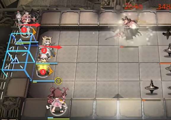 随后部署【①澄闪】向右,【②号角】向右,【③塞雷娅】,挂机即可。