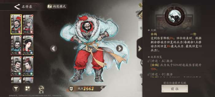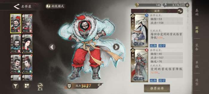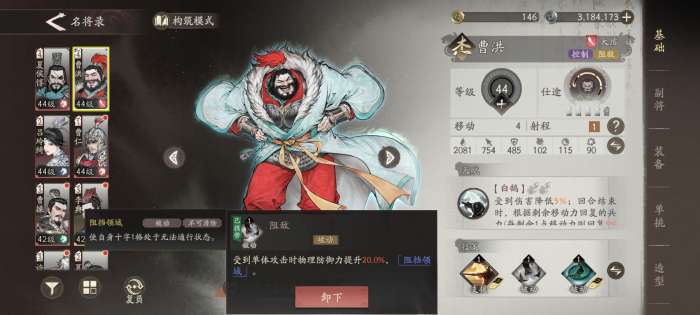 如果没有高星级的副将,也可以用主线赠送的红副将【蔡邕】来堆面板。如果再搭配上鲍信,曹洪的战意积攒的非常快。不过个人不推荐这种搭配,及目前的养成难度,大部分玩家基本上主升骑兵,根本没有材料来升近卫,所以牺牲生存来换取没升级的战法不太值当。