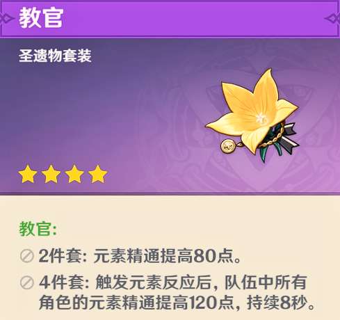 教官四件套可以触发元素反应,此时队伍中的所有角色精通值会提高120点。如果在草行久四号位置搭配的角色不是站场主c角色(比如艾尔海森),那么可以考虑使用这套圣遗物。