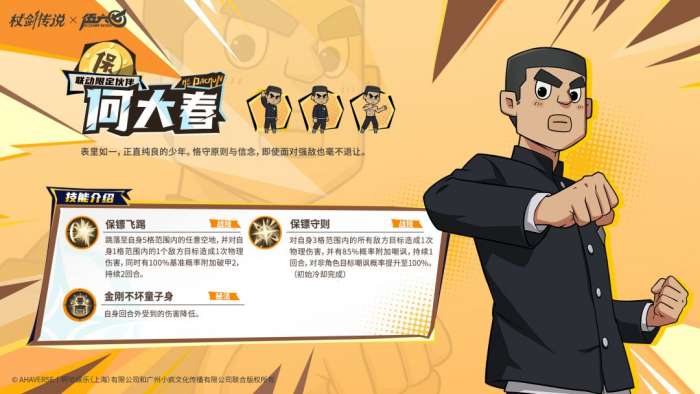 软件提交 专题合集 热门手游杖剑传说联动伍六七角色何大春他表里如一,正直纯良的少年,恪守原则与信念,即使面对强敌也毫不退让,技能如下:保镖飞踢(跳至空地攻击并附加破甲)、保镖守则(范围群伤附加嘲讽)、金刚不坏童子身(回合外减伤)。技能设计体现其正直纯良、恪守原则、毫不退让的护卫形象。