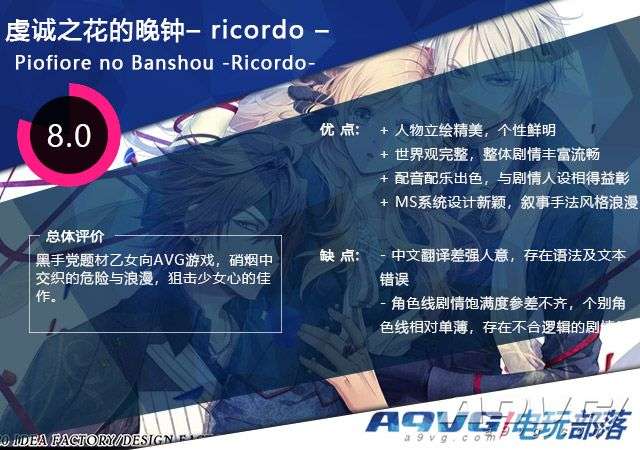 《晚钟》无论是剧情、人设、音画还是表现手法都相当优异,游戏也可以称得上佳作。虽然翻译的问题造成了中文版的美中不足,但仍瑕不掩瑜,热爱乙女游戏却又因语言障碍的玩家也大可不必望而却步。也希望这次汉化可以成为厂商们探索汉化道路上的经验,在未来能够见到更多的优秀乙女作品中文化。