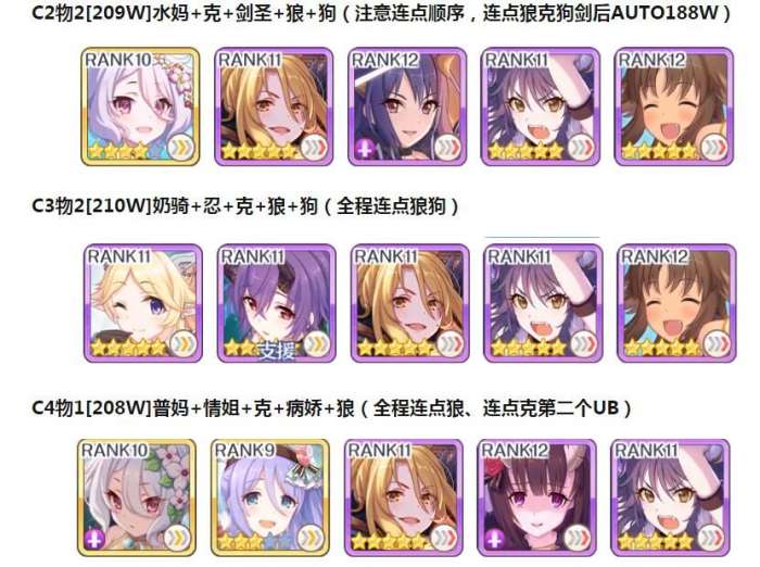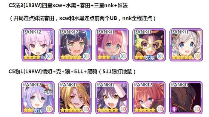 例:【C1环物2】:三阶段一王物理刀,需要自己的BOX有环奈,可单日单BOSS出二连刀;相比跨BOSS分刀,亏损伤害较高