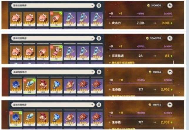 高级“狗粮”(五星已强化的废弃品,4、8、12、16、20+的高级五星狗粮,部分不可控因素如该等级下多余的经验条约算忽略不计) 如图