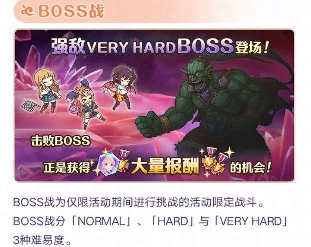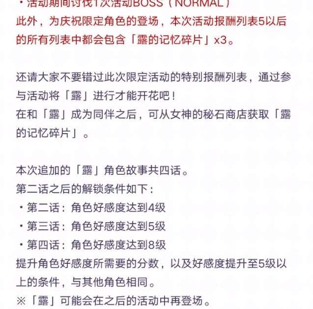 讨伐活动限定的关卡及BOSS,即可获得活动专属报酬,解锁限定的活动剧情,并获得活动限定联动角色★1「露」哦。