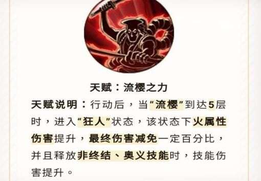 流樱之力:行动后当“流樱”到达5层时,进入“狂人”状态,该状态下火属性伤害提升,最终伤害减免一定百分比,并且释放非终结、奥义技能时,技能伤害提升。