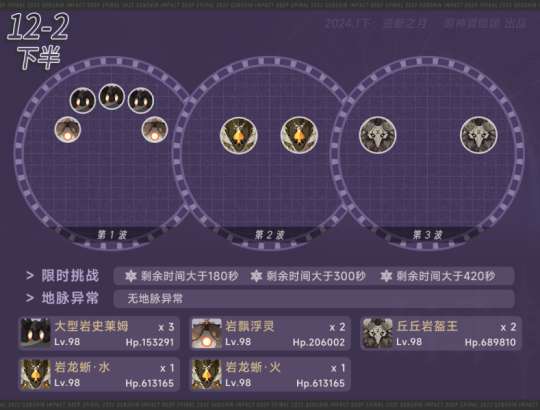 多波次敌人:岩史莱姆、岩漂浮灵、岩龙蜥、岩丘丘王