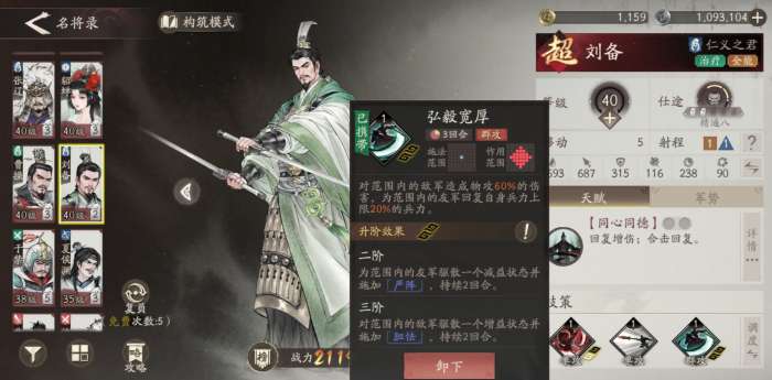 当升迁达到10级时,刘备将在每次进行合击或追击前,为自己回复10%兵力,显著增强续航能力。其主动技“刀剑生辉”可对目标敌人造成120%的物理伤害,同时为另一名兵力最低的友军回复30%兵力,并为自己额外回复15%兵力。“催锋”则专注于单体输出,能对单一敌将造成130%伤害,并清除目标身上两个增益状态。
