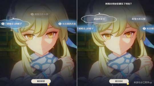 (3)点击上图【进行联想】后,接着选择【「檐帽会」的帽子】,再点击【触发联想】,最后选择【遗留的发卡】后点击【提交结论】,即可完成该次推理解密