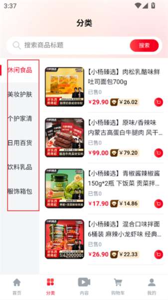 分类页面将商品进行了详细的归类,包含了日用百货、饮料乳品以及美妆护肤等。