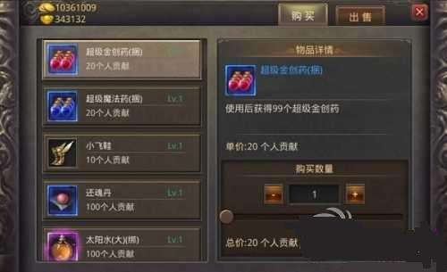 行会商人就在比奇城的飞行点附近,点击右上角地图就可以传送到。点击之后可以看到对应的补给物品,除了红蓝药还有太阳水小飞鞋等需要金券或者元宝才可以获得的道具,并且购买并不需要任何金币,需要你的个人贡献。只要平时努力做任务的话,想要积攒也是非常容易的。