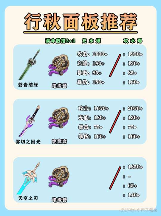 你的行秋还在傻傻的只堆充能吗,错啦!行秋虽然需要大招启动来辅助队友挂水,但是他的输出能力也非常出色。因此,在确保行秋充能充足的情况下,还要提高他的双暴能力,以补充队伍的伤害。
