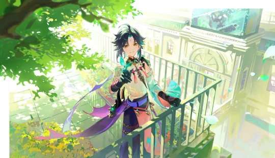 魈的风景展示看起来是一个顶楼,上满还有很多的鲜花,在树荫下,魈面带笑容,与蝴蝶进行着互动。这么好的天气,不出去走走就说不过去了。