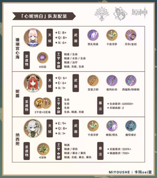 ③ 纳西妲一般无法被替换,但在万不得已时也可选择草元素旅行者或柯莱过渡。