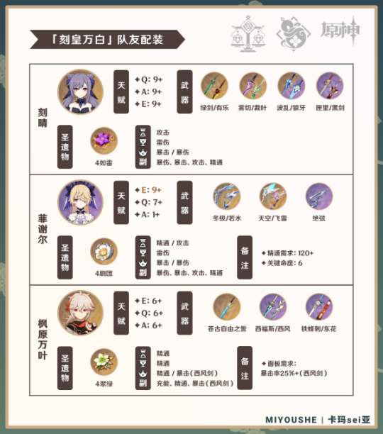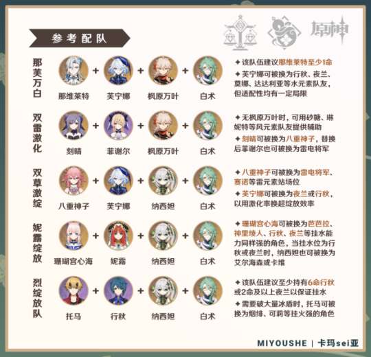 ① 可将八重神子换为雷电将军、赛诺等雷元素站场位以组成「雷芙纳白」、「赛芙纳白」等队伍,替换后爆发输出或队伍总伤可能提高,但灵活性可能降低。