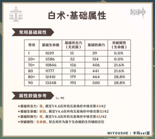 ✦白术具有明显的远程辅助角色特征,基础攻击与基础防御均很低,但由于辅助能力依赖生命值上限,基础生命较高。