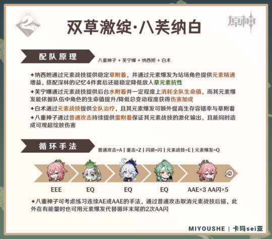 ✦「纳行久白」:纳西妲+行秋+久岐忍+白术。虽然这是从经典的「纳行久」队伍衍生而来的,但仅凭纳西妲挂草就能保证超绽放效率。而白术在生存和基础强度方面,通常都不如钟离、北斗等第四人。可以尝试将久岐忍换成雷电将军,但这样会使得雷电将军站场更佳,从而将队伍变成了「雷行纳白」的激绽队。