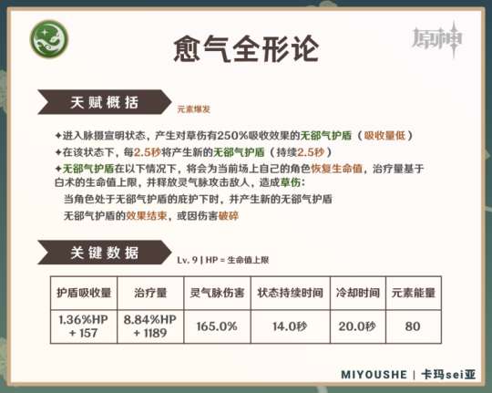 ②灵气脉只能使弱草附着(1元素量),而且没有附着冷却时间。由于白术命之座能力较低,只有大招能让草附着长时间存在,总共只有6次机会。在“那芙万白”或双雷激化队伍中,这不会对需要水扩散/雷扩散反应的翠绿之影4件套产生太大影响。但在绽放类队伍中,灵气脉的效果通常不够,因此需要与纳西妲一起使用。