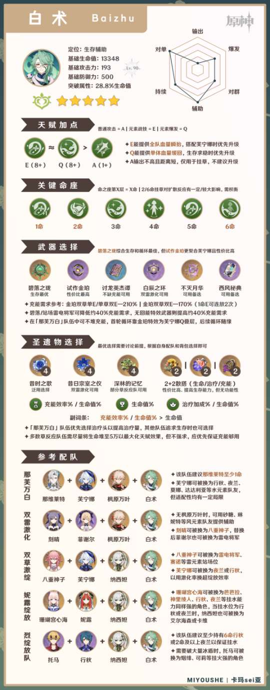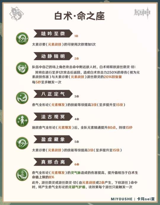 ✦6命:这种命座能够大幅提高白术的护盾和治疗频率,从而提高了挂草的频率,同时在抗打断和防斩杀能力以及附着能力方面都有巨大提升。但是,这也会严重阻碍水扩散和雷扩散的触发,因此即使真的需要这种程度的生存和挂草能力,也需要考虑它的局限性。