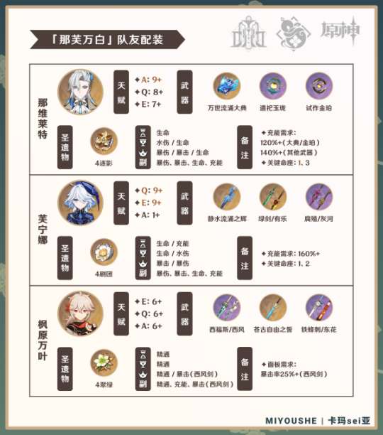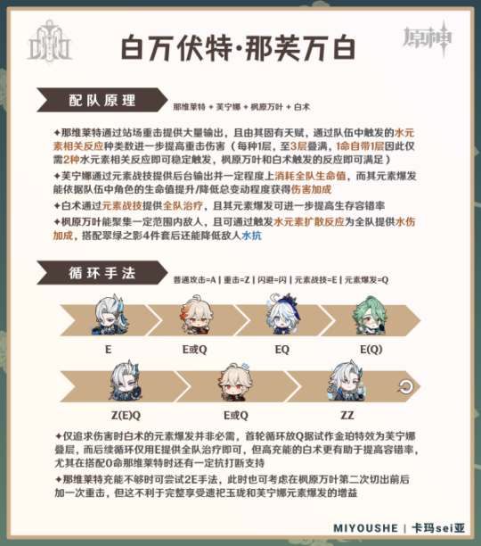 ④「那芙万白」:可不堆叠充能,首轮循环施放大招利用试作金珀为芙宁娜大招增益叠层即可,后续循环随缘(但高充能的白术有助于提高容错率)。
