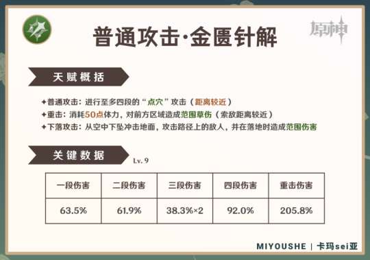 ②普通攻击和重击都只能附着弱草元素(1元素量)。普通攻击的附着冷却属于默认组别(2.5秒/3次攻击,即每2.5秒内,攻击3次中的第1次提供附着)。一套普通攻击4段可以在2.5秒内完成,因此可以造成2次弱草附着(分别来自第1和第4段攻击)。此外,重击没有附着冷却时间。