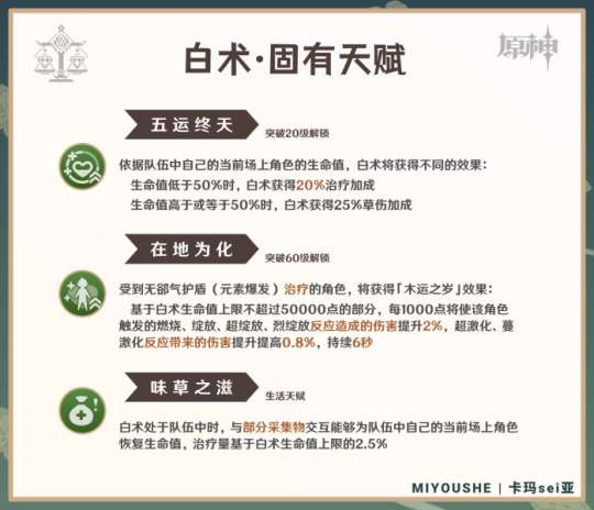 ③生活天赋在探索大世界(特别是水下)时很有用,但需要在附近找到可触发该效果的采集物(比如甜甜花和汐藻)。如果不在水下或其他特殊环境中,白术自身就具备治疗能力,而无需启动任何成本。