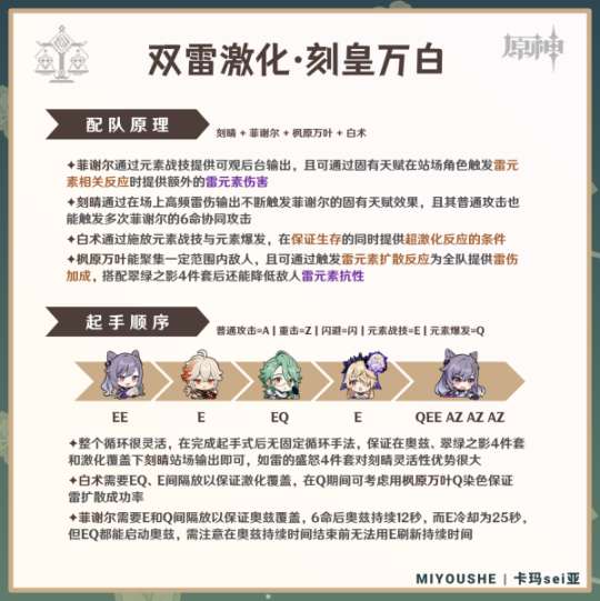 ✦「白行雷夜」:白术+行秋+雷电将军+夜兰。白术主要用于站场,并确保自身的生存能力;行秋和夜兰则提供丰富的水属性附着效果;而雷电将军则能高频触发超绽放。这个队伍的理论输出相当不错,但由于白术普攻距离短,而且4深林对群覆盖率较低,实战中难度较大。如果将夜兰换成北斗,这个队伍则具有卓越的生存能力,几乎无法被高伤害敌人击败。