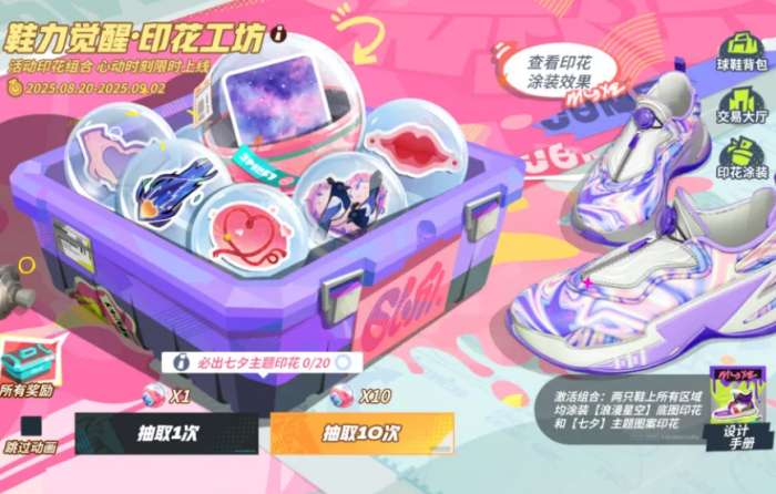 从8月20日开始,到9月2日这段时间,你不仅能在赛场上体验速度与激情,还能感受浓浓的七夕情怀。这个活动最让人期待的部分,莫过于“鞋力觉醒·印花工坊”这个限时玩法。你可以用印花解码蛋来进行抽奖,最多20次的抽奖机会保底会给你一款七夕主题印花。说到这,你是不是已经迫不及待想知道这次的印花有哪些呢?这次可是带来了六款超级浪漫的全新印花,包含浪漫星空、爱心喜鹊、红绳、流星等,每一款都充满了甜蜜的象征,简直让人看一眼就心动。