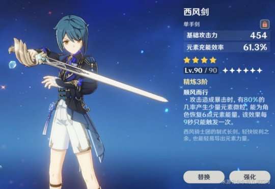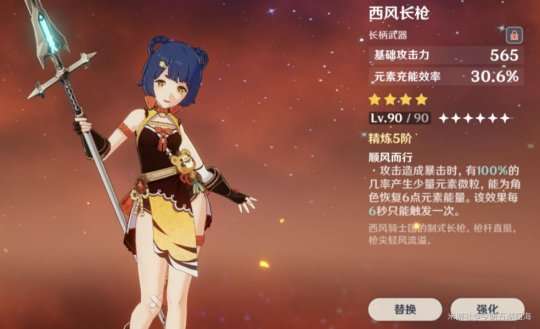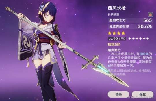 推荐理由:西风长枪的被动效果在暴击时可以恢复元素能量。提升元素爆发循环。