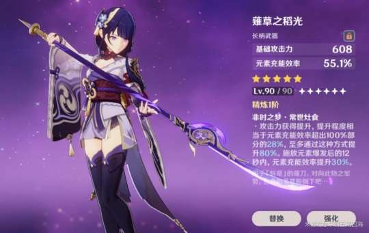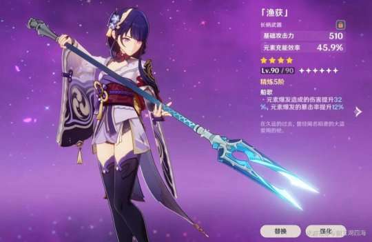 如果你还没有得到五星武器,那么西风长枪和渔获都是很不错的替代选择。特别是在与雷电将军的输出循环中,渔获的充能效率和暴击率提升非常适合。