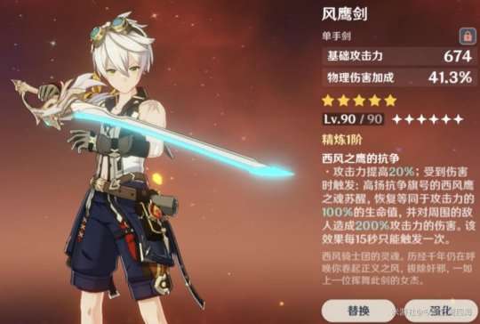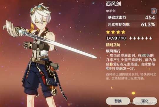 推荐理由:四星面板基础攻击力(也称“白值”)最高的剑,90级有620基础攻击力可以堪比一些五星武器。(我自己没升所以解释一下