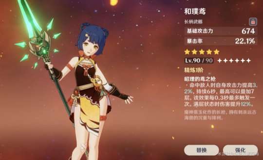 推荐理由:高白值加上暴击率的副词条在香菱手上也是游刃有余,武器在输出方面也是可以的,不过需要注意充能方面,虽然国家队有雷神可以充能还是需要注意的。在圣遗物方面就可以带充能沙爆伤头。