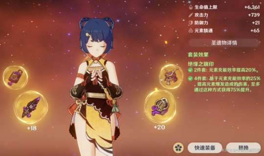 注:香菱非常依赖元素充能效率,因此在选择圣遗物时,应确保至少达到220+的充能效率,以保证能够频繁释放元素爆发回能循环。