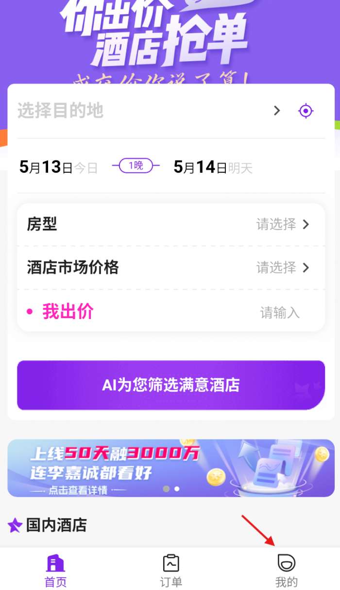 1.打开惠选订房,点击我的。
