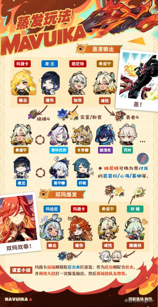 ④ 如果是没有太多角色的萌新,又恰好抽到本期的全部4星UP角色(卡齐娜/迪奥娜/班尼特),那么可考虑直接与玛薇卡组队!让玛薇卡开大斩击触发融化即可,后续重击输出触发融化随缘,作为新手前期过渡体验也不错。
