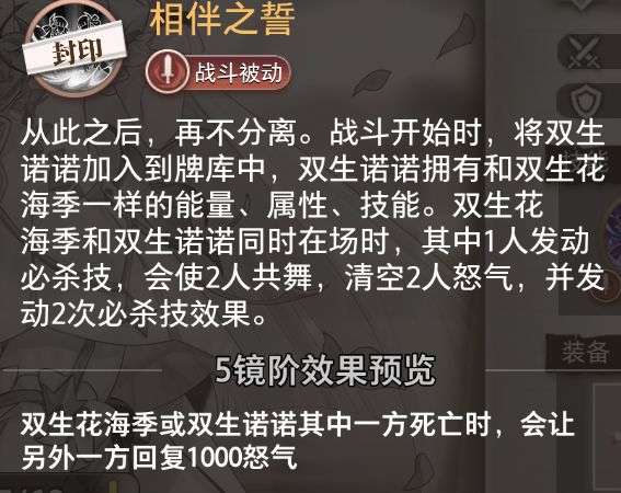 2级效果为双生·花海季与双生·诺诺同时在场时,为自身及我方队长添加1层免死效果(无法叠加/驱散),同时基础攻击、防御、生命+5%。