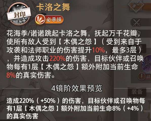 四星后,必杀技伤害提升至攻击270%,且每层“木偶之怨”使召唤物或伙伴多承受当前生命值12%的真实伤害。