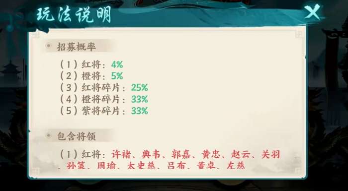 点将令可在点将台中使用,每次点将需消耗一枚点将令,支持单抽与十连抽,能抽出红将、橙将等不同品质的武将,也有概率只抽出武将碎片。但好在游戏有着三十抽保底红将的机制,因此也令红将的获取难度并不是特别的高,全红将阵容对零氪玩家来说也并不是遥不可及的心愿,只要各位多多去进行点将令的收集,便可将点将台中的武将全部收集到手。
